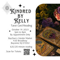 Step into the enchanting world of Kindred by Kelly Tarot Card Readings. Join us at BayOwn's Vendor Market, located at 920 Broadway, Bayonne, NJ, on October 19th from 5 to 8pm. Please note that appointments are available by reservation only, ensuring a personalized and mystical experience.