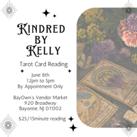Step into the enchanting world of Kindred by Kelly Tarot Card Readings. Join us at BayOwn's Vendor Market, located at 920 Broadway, Bayonne, NJ, on June 8th from 12pm to 5pm. Please note that appointments are available by reservation only, ensuring a personalized and mystical experience.